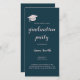 Invitation pour une fête de remise de diplômes bleu prussien/bleu marine et beige. Design minimaliste avec chapeau de diplômé et texte promotion 2023. Téléchargez la version numérique et envoyez les invitations de remise de diplômes par SMS.