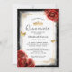 Faites une déclaration audacieuse et inoubliable avec ces élégantes invitations quinceañera, conçues dans un schéma de couleur rouge, noir et blanc dramatique. Parfait pour un 15ème anniversaire, un doux 16 ou un mariage de rose rouge, ce modèle modifiable vous permet de personnaliser l'élégant script de calligraphie, le libellé et les détails pour correspondre à votre événement spécial. Le design royal est composé de roses d'aquarelle rouge vif posés sur un parchemin d'aquarelle blanc doux, encadré d'une bordure dorée ornée pour un flair vintage. Une délicate couronne d'or / tiara princesse et confetti de papillon dispersé ajoutent une belle touche de faux shimmer et de charme festif. Sur le dos, il y a de la place pour inclure un libellé supplémentaire ou une belle photo de Mis Quince Años au-dessus des roses d'aquarelle noire. Si vous souhaitez en faire un véritable vôtre, vous pouvez même échanger les papillons, la couronne et les éléments floraux avec d'autres options de couleur. Avec sa riche palette et sa touche de glamour, cet invitation modèle est également parfait pour un bal mascarade ou un thème romantique de la fête mexicaine. Catégorie : 15/16/15 ans d'élégantes invitations à la quinceanera; invitations à la quinceanera florale; invitations à la coing gothique. Couleurs du thème de la quinceanera noire et rouge : rouge vif, bordeaux, marron, rouge foncé, or champagne jaune, noir et blanc.