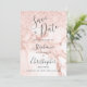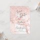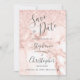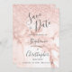 Un design chic et moderne avec une élégante arrière - plan en marbre décorée de faux parties scintillant dans les tons or rose, rose et blanc. Les mots "Save the Date" et les prénoms de la mariée et du marié apparaissent dans le script gris fusain, avec le texte restant dans la police sans serif. Le marbre et la parties scintillant se répètent à l'envers.