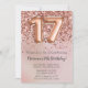 Elégante invitation de fête rose or 17ème anniversaire pour une fille de 17 ans avec un script élégant avec une police noire et des ballons de papier amusant.