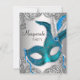 Belle turquoise masque en plumes bleu argent et turquoise bleu masquerade invitation. Cette élégante invitation à la mascarade bleue turquoise est facilement customisée pour votre événement en ajoutant les détails de votre événement, le style de police, la taille et la couleur de police et le libellé.