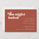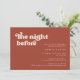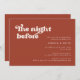 La veille... Assurez-vous que tout est parfait pour le grand jour; recevez des invitations modernes pour votre dîner de répétition mariage. Un thème rétro chic : adoptez ce design typographique légèrement vintage et élégant pour votre papeterie mariage, avec un thème orange brûlé, terre cuite, sucre brun et rose pêche. Texte, couleurs et arrière - plans entièrement personnalisables.
