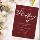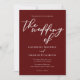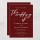 Cette solide faire-part de mariage bordeaux présente un script blanc classique pour une mariée et un marié qui se marient dans un lieu de soirée formel. Embrassez le romantisme avec cette couleur riche et audacieuse. Invitations minimalistes et romantiques de typographie pour un couple moderne.