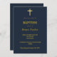 Invitation Élégante typographie or Croix Baptême sur bleu mar