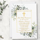 Moderne Elégant Première Sainte Communion Invitation inclut des feuilles d'eucalyptus aquarelle et d'autres beaux feuillage botanique verdoyant. Croix d'or.