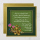 Invitation élégante de mariage de style ancien pour le cinquantième anniversaire de mariage, réalisée dans un motif de damas vert. Des graphiques d'un cadre de ton vert foncé et or entourent la zone de texte vert clair, et ont une décoration florale en ton doré et émail dans le coin inférieur gauche. Le texte en blanc est prêt à être personnalisé pour l'événement.