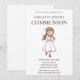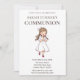 Célébrez la journée spéciale de votre fille avec cette belle invitation à la Première Communion, avec une illustration d'une fille souriante dans une robe de communion classique. Ce design élégant et chaleureux est parfait pour inviter famille et amis à se joindre à la célébration sacrée. Customisez facilement avec le nom de l'honoré, les détails de l'événement et un message personnel pour créer un gardien unique pour cette étape importante