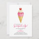 Sweet She's Been Scooped Up! invitation à la douche nuptiale avec un cône gaufre, une boule de crème glacée rose, des arrosées, de la crème fouettée et une cerise cardiaque. Parfait pour une soirée de douche nuptiale à la crème glacée. Voir la coordination des articles dans notre boutique, Enchanted Finch.