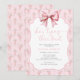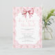 Elle est en train de nouer l'invitation à la douche nuptiale de la poule rose du noeud. Belle arbalète rose élégante avec cadre à coquilles Saint-Jacques et joli arrière - plan de papier peint rose. Doux comme la mariée à être. Accent du coeur écriture scénarisée dans une teinte rose douce et romantique.
