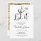 Cette élégante invitation à la fête de remise de diplômes en noir et blanc "Elle l'a fait" peut être personnalisée avec la photo spéciale de votre diplômé au verso. Conçu par Thisisnotme©
