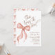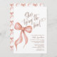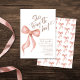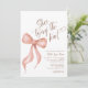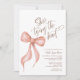 Elle joue le noeud Blush Bow Bridal Shower Invitation. Une élégance simple. FRONT : Dispose d'un joli arc rose vif style aquarelle et écriture calligraphie manuscrite en marron. Vous êtes libre de modifier la couleur du texte, y compris la phrase en haut. DERRIÈRE : Un motif à arc tout-en-un. ©Kimbellished, LLC
