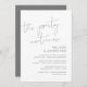 Ceci est la carte d'invitation à la fête de fuite de mariage, avec un design de script minimaliste / minimaliste gris foncé (La fête continue)