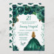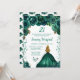 Cette invitation d'anniversaire élégante et glamour présente une belle princesse aux cheveux blonds et à la peau claire dans une robe vert émeraude. Le texte combine écriture manuscrite et polices sans serif modernes pour un look élégant et sophistiqué. Les compositions florales, papillons et confettis créent un mélange parfait de rustique et de chic. Graphiques par www.etsy.com/uk/shop/SunflowerDayLove