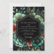 Experience a dramatic and lush botanical aesthetic, featuring deep emerald and teal succulents and foliage. These vibrant greens are highlighted by brilliant bursts of orange and red blossoms. This moody and elegant design evokes a sense of romance against a dark, dramatic backdrop, perfect for a sophisticated affair.