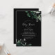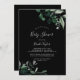 Cette invitation au baby shower noir vert émeraude est parfaite pour un baby shower boho. Le design élégant et rustique présente des feuilles d'aquarelle vert foncé moody et des eucalyptus aux tons bohèmes modernes.