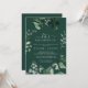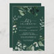 Cette invitation verte émeraude est parfaite pour une fête de fiançailles, un mariage après la fête, une retraite, un diplôme ou tout événement heureux. Le design élégant et rustique présente des feuilles d'aquarelle vert foncé moody et des eucalyptus aux tons bohèmes modernes.