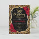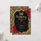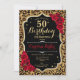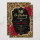 Elégante invitation féminine 50ème anniversaire avec votre photo au dos de la carte. Design noir de verre avec empreinte de léopard animal et faux or parties scintillant. Comprend des roses rouges, des caractères de script et des confettis. Parfait pour une fête anniversaire adulte élégante. Personnalisez avec vos propres détails. Peut être customisé pour n'importe quel âge ! Invitations Zazzle imprimées ou téléchargement instantané modèle imprimable numérique.