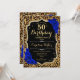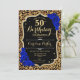 Elégante invitation à 50ème anniversaire avec votre photo au dos de la carte. Décor noir bleu royal avec un empreinte de léopard animal et faux or parties scintillant. Caractéristiques saphir bleu rose, police de script et confetti. Parfait pour une fête anniversaire adulte élégante. Personnalisez avec vos propres détails. Peut être customisé pour n'importe quel âge ! Invitations Zazzle imprimées ou téléchargement instantané modèle imprimable numérique.