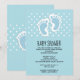 Invitation à une baby shower avec une charmante image d'empreintes de pieds de bébé garçon bleu avec un contour blanc épais.