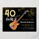 Feuille de parties scintillant or 40 Rocks rock and roll or parties scintillant 40e anniversaire invitations à la fête avec une guitare électrique cool avec motif coloré funky et orange flamme rampante garde-piqûre art et notes musicales illustration avec typographie de calligraphie moderne noir et or personnalisée. Ce modèle facile d'utilisation crée l'invitation personnalisée parfaite à la quarantième fête pour célébrer quarante dans le style rock n roll et est idéal pour un guitariste, musicien et mélomane amoureux. Instrument de musique moderne unique Oeuvre originale de l'artiste Catherine Sweetman