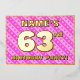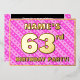 La façade de cette carte d'invitation amusante et joyeuse fête de soixante-troisième anniversaire/fête de fête comporte un nom personnalisé, un grand numéro "63e", le message "FÊTE D'ANNIVERSAIRE !", et une frontière. L'arrière - plan de l'avant a un motif aimante rose clair et rose foncé rayures, aux formes de coeur. Le verso présente des détails personnalisés sur l'événement, tels que la date, l'heure, l'emplacement et toute autre information importante. Des invitations personnalisables comme celles-ci pourraient être une façon amusante pour les invités invitations à une fête d’anniversaire qui se tient pour célébrer le 63e anniversaire de quelqu’un. [~Z0000603]