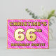 La façade de cette joyeuse carte d'invitation de fête de soixante-sixième anniversaire/fête de fête comporte un nom modifiable, un grand numéro "66e", le message "FÊTE D'ANNIVERSAIRE !", et une frontière. L'arrière - plan de l'avant a un amusant motif rose foncé et rose clair rayures, avec des formes de coeur. Le verso présente des détails personnalisés sur l'événement, tels que la date, l'heure, l'emplacement/le lieu et toute autre information qui peut être importante. Des invitations modifiables comme celles-ci pourraient être une façon amusante pour les invités/participants invitations à une fête d’anniversaire organisée pour célébrer le 66e anniversaire de quelqu’un. [~Z0000603]