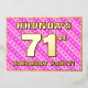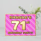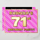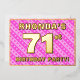La façade de cette carte d'invitation de soixante-et-onze ans optimisée et joyeuse comporte un nom modifiable, un grand numéro "71e", le message "FÊTE D'ANNIVERSAIRE !", et une frontière. L'arrière - plan de l'avant dispose d'un motif amusant avec des rayures rose clair et rose foncé et des formes cardiaques. Le verso présente des détails personnalisés sur l'événement, tels que la date, l'heure, l'emplacement et toute autre information qui peut être importante. Des invitations customisées comme celles-ci pourraient être une façon amusante pour les participants/invités invitations à une réunion d’anniversaire ou à une fête organisée pour célébrer le 71e anniversaire de quelqu’un. [~Z0000603]