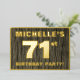 Le recto de cette carte d'invitation audacieuse de soixante-et-onze ans/fête de fête comporte un nom personnalisable, un grand numéro "71e", le message "FÊTE D'ANNIVERSAIRE !", et une frontière, le tout en papier peint. Il y a un style rustique, mais élégant, de faux grains de bois inspiré motif pour l'arrière - plan de l'avant. Le verso présente des détails personnalisés sur l'événement, tels que la date, l'heure, le lieu/lieu et toute autre information qui peut être utile. Des invitations modifiables comme celles-ci pourraient être utilisées pour les participants invitations/invités à une fête d’anniversaire qui se tient pour honorer le 71e anniversaire de quelqu’un. [~Z0000598]