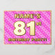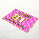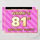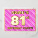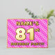 La façade de cette carte d'invitation joyeuse et amusante de quatre-vingt-et-unième anniversaire/feuille de fête comporte un nom modifiable, un grand numéro "81st", le message "BANTHDAY PARTY!", et une frontière. L'arrière - plan de l'avant a un motif rayé rose foncé et rose clair, avec des formes cardiaques. Le verso présente des détails personnalisés sur l'événement, tels que la date, l'heure, le lieu et toute autre information qui peut être importante. Des invitations personnalisables comme celles-ci pourraient être une façon amusante pour les participants invitations à une fête d’anniversaire organisée pour célébrer le 81e anniversaire de quelqu’un. [~Z0000603]