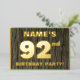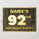 Le recto de cette carte d'invitation audacieuse pour fêter quatre-vingt-douze ans et fêter un festin comporte un nom personnalisé, un grand numéro "92e", le message "FÊTE D'ANNIVERSAIRE !", et une frontière, le tout en papier peint. Il y a un aspect rustique, mais sophistiqué, de grain de bois inspiré motif pour l'arrière - plan du front. Le verso présente des détails personnalisés sur l'événement, tels que la date, l'heure, le lieu et toute autre information qui peut être importante. Des invitations personnalisées comme celles-ci peuvent être utilisées pour les invités/participants invitations à une fête d’anniversaire organisée pour célébrer le 92e anniversaire de quelqu’un. [~Z0000598]