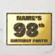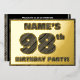 La façade de cette audacieuse carte d'invitation pour fêter quatre-vingt-dix-huitième anniversaire et fêtes porte un nom personnalisé, un grand numéro "98e", le message "FÊTE D'ANNIVERSAIRE !", et une bordure, toutes avec un motif rustique, mais élégant, d'apparence de grain de bois inspiré. Le verso présente des détails personnalisés sur l'événement, tels que la date, l'heure, le lieu et toute autre information pertinente. Des invitations customisées comme celles-ci peuvent être utilisées pour les invités/participants invitations à une fête d’anniversaire organisée pour célébrer le 98e anniversaire de quelqu’un. [~Z0000595]