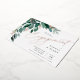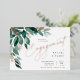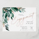 L'élégante invitation à la fête de fiançailles présente des feuilles d'eucalyptus aquarellés et du feuillage vert en cascade du coin supérieur gauche, agrémenté d'accents roses en feuille d'or. Personnalisez avec les détails de votre partie de fiançailles alignés à droite. Cartes inversées à vert de forêt solide.