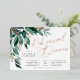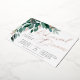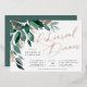 Elegant wedding rehearsal dinner features watercolor eucalyptus leaves and green foliage cascading from the upper left corner, embellished with rose gold foil accents. Personalize with your ceremony rehearsal and celebration details aligned at the right. Cards reverse to solid forest green.