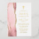 Le bord gauche de cette élégante invitation à la première communion moderne comporte une bordure d'aquarelle rose vif, ornée d'une fausse parties scintillant dorée. Une petite croix apparaît au-dessus du texte personnalisable, qui combine écriture manuscrite, copperplate et italique en véritable feuille d'or sur un arrière - plan blanc. L'envers est assorti d'un design d'agate en blush et or. Idéal pour la première communion d'une fille.