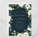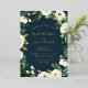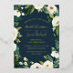 Notre faire-part de mariage Albâtre entoure vos détails de mariage avec un cadre de verdure aquarelle peinte, feuillage botanique et fleurs de roses et de pivoines blanches sur un riche arrière - plan bleu marine. Les détails de votre mariage sont affichés en papier doré chic avec accents manuscrits.