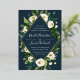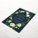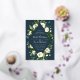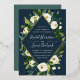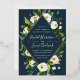 Nos faire-part de mariage en albâtre encadrent vos détails mariages avec une aquarelle peinte et un feuillage parsemé de pivoines blanches et de roses. Un choix moderne mais organique en vert et blanc avec des botaniques luxuriants et des lettres manuscrites sur un riche arrière - plan bleu marine. La finition en feuille d'or complète le design pour un look luxueux.