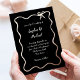 Cette invitation de mariage chic et élégante présente un cadre dessiné à la main et ondulé en papier or rose avec un arc, et un script design écrit à la main en ivoire sur un arrière - plan noir foncé pour un faire-part de mariage de style parisien ou français.