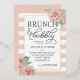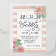 Stylish bridal shower invitation features pink watercolor peonies and a blush pink striped background with "brunch and bubbly" and your bridal shower details in the center. Gold foil trim completes the design.