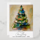 Festive Aquarelle Arbre de Noël Arbre Artistique Or Foil Carte de vacances. Dessin d'aquarelle festif d'un sapin de Noël coloré avec un joyeux souhait de Noël dans un script branché et de véritables détails de feuille d'or.