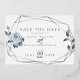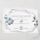 VRAI FOIL Enregistrer la date | Aquarelle Dusty Blue Floral Wedding Enregistrer la date | Boho couleur bleu azur roses entourent un cadre géométrique de terrarium argenté de style terrarium avec de la végétation sauge. Reverse est un bleu poussiéreux gratuit. Personnaliser texte, style de police, couleur et taille. OEuvre originale créée pour BarefootBride™ par © WhimsicalArtwork™ - Il s'agit d'une suite de papier à lettres Mariage complète avec papier à lettres mariage, baby shower et autres articles de papeterie d'événements correspondants.