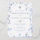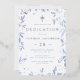 Une élégante invitation pour le dévouement ou le baptême de votre fils. Le design comporte une bordure de bleu feuille d'aquarelle et une croix de feuille d'argent en haut. Personnalisez avec les détails de l'événement en papier bleu et argent. Au verso se trouve un motif de feuilles bleus.