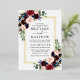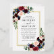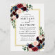 Elégante aquarelle moderne Burgundy Blue Floral Faire-part de mariage comprend des roses bordeaux, des roses roses roses, des fleurs bleues, des fleurs rouges, des feuilles d'eucalyptus et de la végétation botanique. Deux cadres - Double cadre - Gold Foil