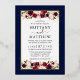 Aquarelle moderne Elégante Bourgogne Le Faire-part de mariage Floral comprend des roses bordeaux, des roses roses roses, des roses rouges et une végétation botanique. Cadre à huile d'or. Arrière - plan bleu marine.