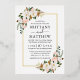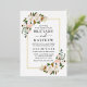 Aquarelle moderne Elégante Rose Blanc Floral Faire-part de mariage comprend roses roses roses, magnolias blancs, feuilles d'eucalyptus, coton et verdure botanique. Cadre à huile d'or. Photo De Retour.