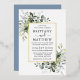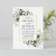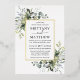 Le Faire-part de mariage moderne Elegant Greenery comprend une végétation botanique, des feuilles d'eucalyptus et des feuilles bleus poussiéreux. Bleu Dusty Back. Cadre à huile d'or.