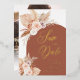 Annoncez à vos amis et proches la date de votre mariage avec des cartes élégantes de mariage sur le thème bohème terracotta automnal avec une calligraphie à feuilles d'or accentuée de roses séchées roses, violettes et blanches peintes à la main, de l'herbe de pampa et une feuille de palmier sur fond d'arche en terracotta. Vous pouvez également placer une photo de votre choix au dos. (Crédits photo à Junior Reis d'Unsplash.)