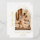 Elegant and timeless, this gold foil Save the Date invitation is designed to make a lasting first impression. A beautifully flowing “Save the Date” script runs vertically along the left side of your arched photo, adding a romantic and editorial touch. Your image is framed within a double gold foil arch, creating a striking focal point with luxurious dimension and shine.
