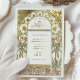 Annoncez votre journée spéciale avec ce magnifique faire-part de mariage Art Nouveau Save the Date, qui présente des motifs floraux complexes et d'élégants motifs dorés. Inspirée par les dessins classiques d'Alphonse Mucha, cette invitation présente un magnifique mélange de tons verts, ivoire et or avec des illustrations botaniques détaillées. L'avant de la carte comprend un luxueux papier doré Enregistrer l'en-tête Date, encadrant les détails du mariage dans un design orné d'arcade. Parfait pour les couples qui apprécient l'élégance intemporelle et les détails artistiques, cette invitation donne le ton d'une célébration mariage sophistiquée et mémorable.