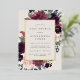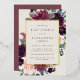 Une invitation au baby shower floral chic présente une bordure de marsala bordeaux violet, rose vif et bleu poussiéreux, avec un feuillage botanique luxuriant et des garnitures verdoyantes et en feuille d'or. Personnalisez avec vos détails de baby shower en lettrage moderne sur un arrière - plan riche crème en ivoire.