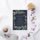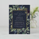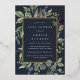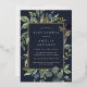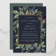 L'invitation à baby shower botanique chic sans sexe comporte une bordure de feuilles botaniques verts luxuriants et de feuillage d'eucalyptus à l'aquarelle avec garniture en feuille d'or. Personnalisez avec vos détails de baby shower en lettres modernes sur un riche arrière - plan bleu minuit.